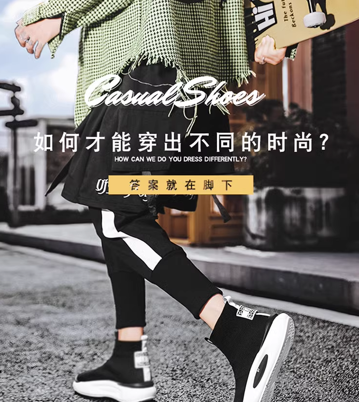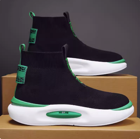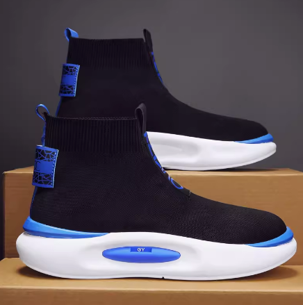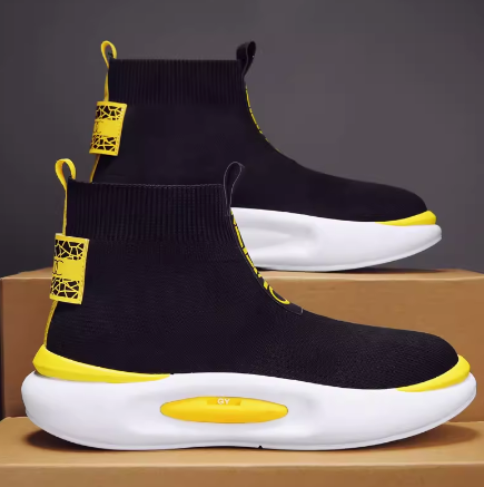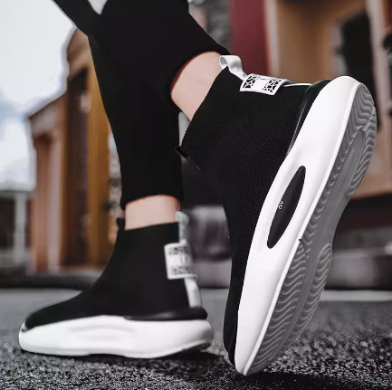 男鞋春季高帮休闲板鞋一脚蹬袜子鞋春秋飞织软底运动增高帆布潮鞋